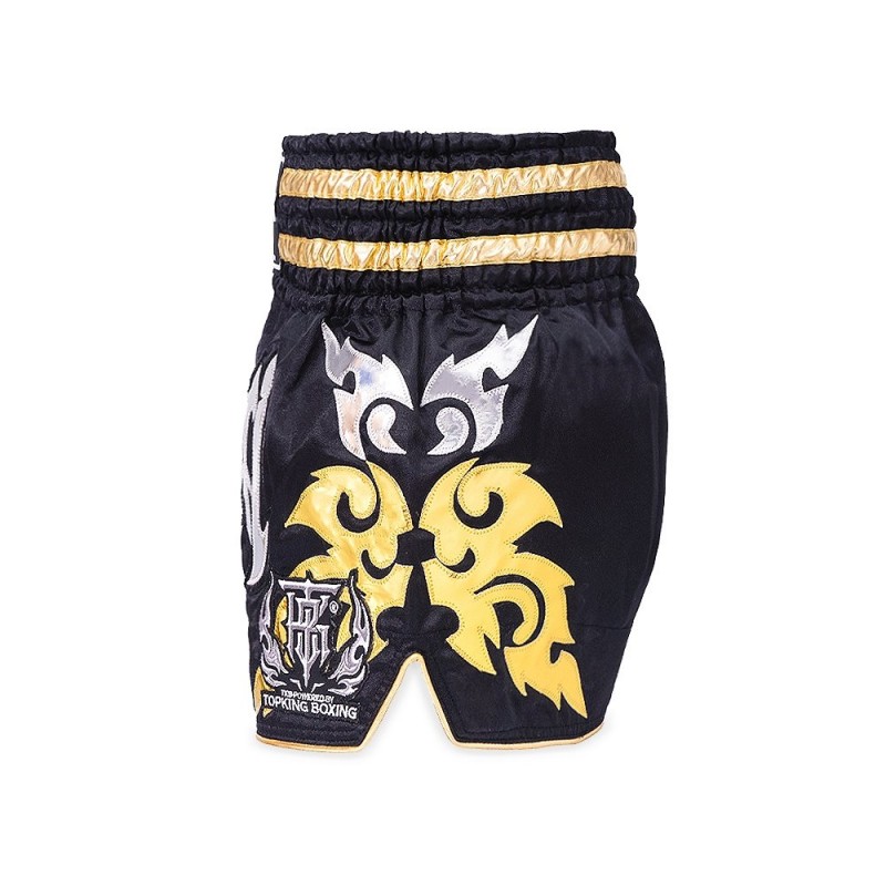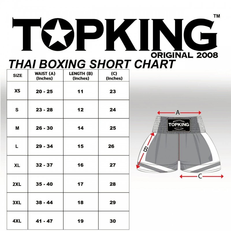 Špičkové Muay Thai šortky od Top King Boxing jsou kombinací pohodlí a funkčnosti. Vynikající kvalita materiálů zaručuje pevnost a pohodlí. Použitá technologie zajistí skvělý odvod vlhkosti a charakteristický rozšířený střih umožňuje velkou volnost pohybu při kopech a úderech koleny. Trenky Top King se těší uznání a reputaci mezi bojovníky Muay Thai a kickboxu po celém světě.